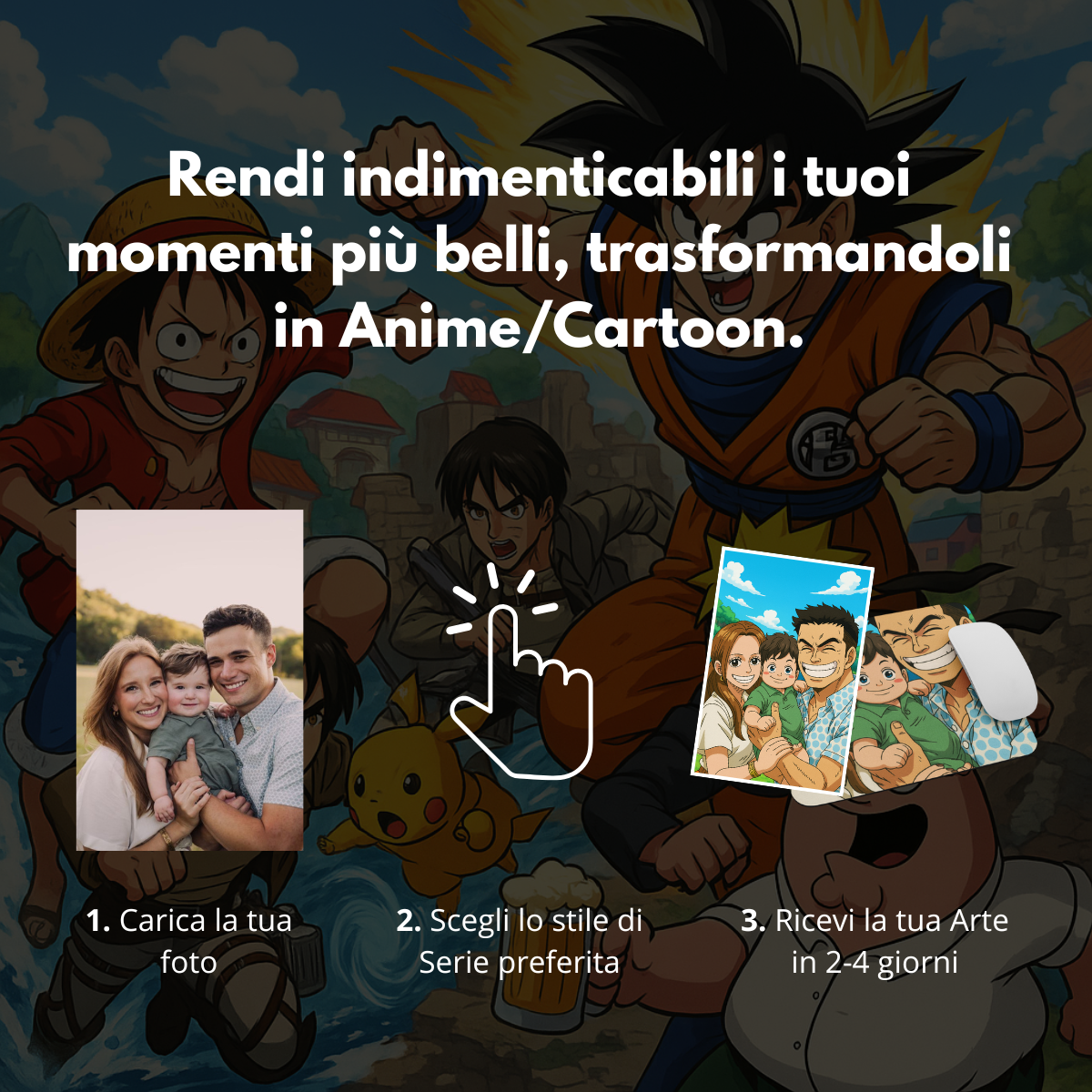 È semplice: carichi la tua foto (o quella della persona che vuoi trasformare), scegli lo stile che preferisci (ad esempio Dragon Ball, One Piece, The Simpsons ecc.) e il nostro team la realizza in versione illustrata digitale.